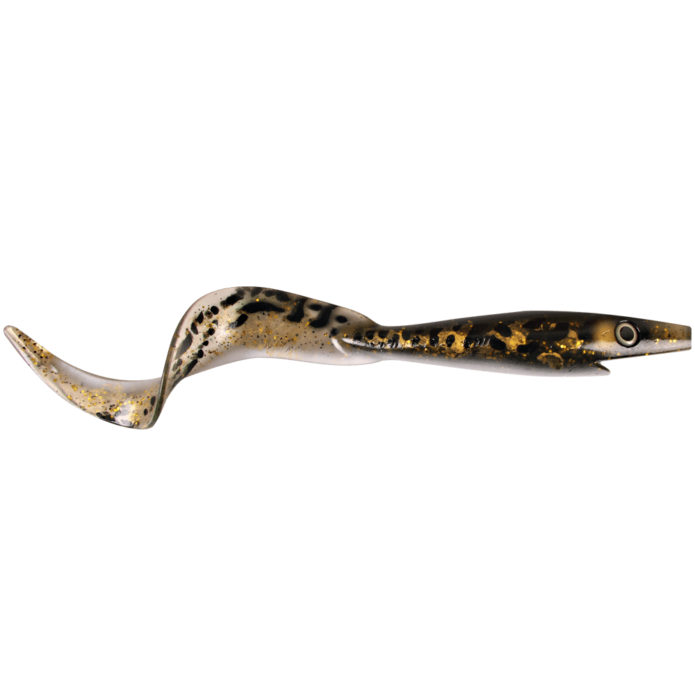 The Giant Pig Tail has a seductive rolling action while the head is slightly rocking from side to side. The tail twists in a low frequent rate and the rattle chamber in the en of the tail creates that clicking sound that can be a real game changer.